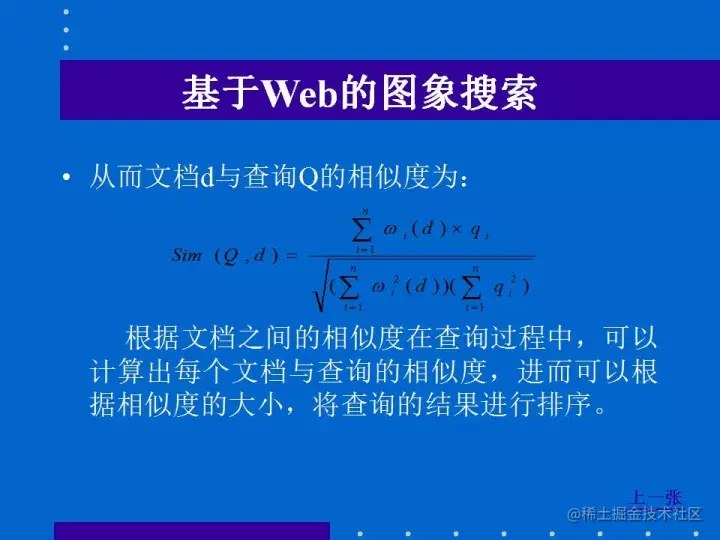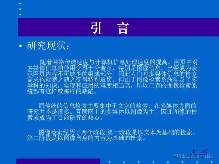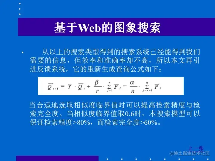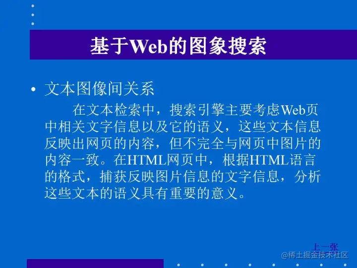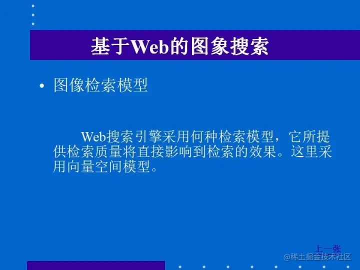 这是一种基于图像本身特征层次的检索,特别适用于检索目标明确的查询要求,但目前这种较成熟的检索技术主要应用于图像数据库的检索。在图像搜索引擎中应用这种检索技术还有一定困难,但己有部分图像搜索引擎尝试了这种检索方法。