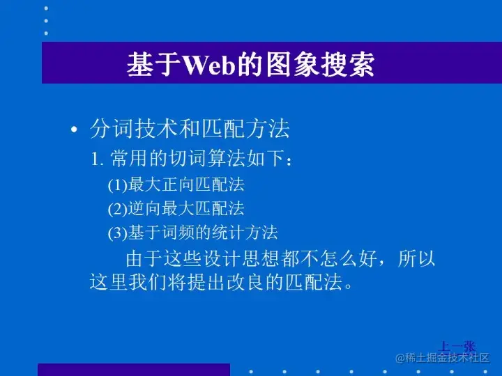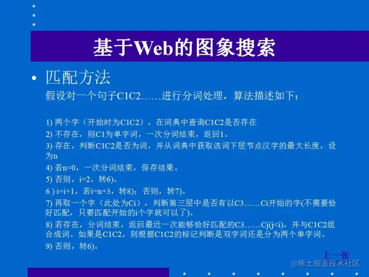 如今在Web中处理图像检索有很多成熟的技术,如基于Web的数据仓库、Web数据挖掘、Web数据源集成技术等。为此,必须为Web建立适当的数据模型,利用数据模型有效地从Web中获取信息。为了处理Web的中文数据,还必须使用一系列中文自然语言处理技术。比较基础的技术有自动分词、人名和机构名的自动识别、自动标引等,其他像信息抽取、自动文摘、文档自动分类、中文概念词的自动发现以及概念词之间的语义关系的确定等技术都必不可少。实现上述技术需要扎实的积累和自然语言处理功底。