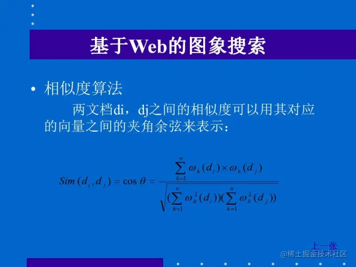两文档之间的相似度可以用其对应的向量之间的夹角余弦来表示,即文档di,dj的相似度可以表示为