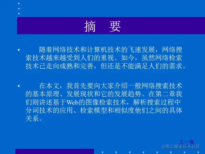 而如何利用现有成熟的传统的图片检索手段,研究出快捷方便而且能迅速提高检索效率的方法,本文将依据现有的搜索引擎和检索手段的研究找到网页中文本与图像之间的内在特点和联系,改进原有的文本搜索使用的模式和方法,提出新的文本相似的匹配算法,并引入检索的反馈技术,把这些技术引入到图像检索中,使得搜索手段更易于实现和提高检索效率。