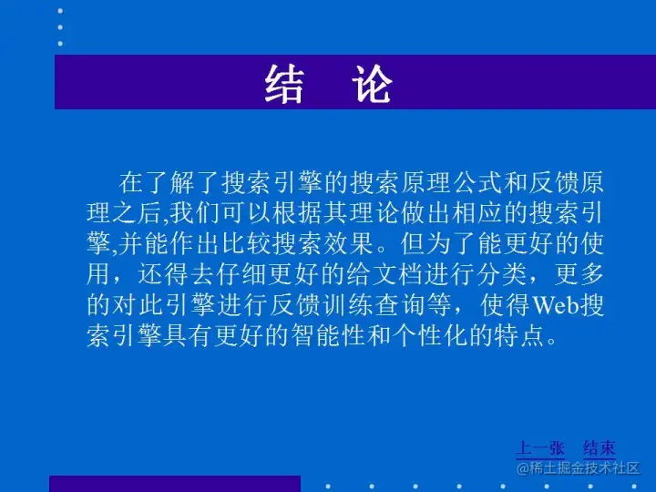 在了解了搜索引擎的搜索原理公式和反馈原理之后,我们可以根据其理论做出相应的搜索引擎,并能作出比较搜索效果。但为了能更好的使用,还得去仔细更好的给文档进行分类,更多的对此引擎进行反馈训练查询等,使得Web搜索引擎具有更好的智能性和个性化的特点。