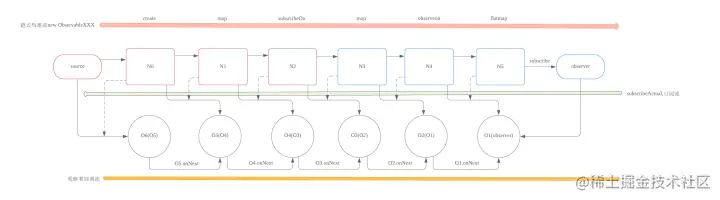 首先我们看上面的图片,先简单解释一下:图中方形的框代表的是Observable,因为它代表节点,所以用Ni表示,圆形框代表的是观察者Observer,用Oi标识,后面加括号的意思是Oi持有其下游Observer的引用,左侧代表上游,右侧代表下游。图片里有三条有方向的彩色粗线,代表三个不同的流,这三个流是我们为了分析问题而抽象出来的的,代表从构建到订阅整个事件的流向,按照时间顺序从上到下依次流过,它们的含义分别是: