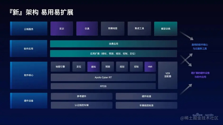 百度Apollo开放平台8.0架构从之前的以软件为中心的技术分层架构,升级到了融合智能驾驶生态体系的全方位新架构,强化了针对具体场景的整体解决方案的剔除,更加方便我们依据自身实际需求进行方案的架构的选型,带来开箱即用的设计思路,提高软件设计效率。 在基础设施(Iass)层面融合了之前的硬件和车辆层级,在新架构中整合成为新的硬件设备层。在此层级中更加注重标准协议的制定,我们可以因此使用各种符合标准规范认证的硬件,同时做相关硬件的开发者也可以根据相应的标准协议就可以方便完成自定义设备的接入。日后能够成为事实硬件协议规范,从而方便我们所有参与者。 在类似于(Pass)层面的软件核心层,提供完成智能驾驶服务搭建的基础软件服务。作为智能驾驶平台,最重要的一环就是感知能力,此次Apollo开放平台8.0升级主要加强了平台的感知能力,这极大的提高了我们软件的竞争力,增强了我们平台的能力。同时PnC的仿真能力也进行了提高,这让我们可以模拟更加真实的环境,在试车前发现更多问题。 全新架构新增了软件应用层,以场景化的形式展现了自动驾驶的模块扩展功能。我们能够根据自身使用需求和真实场景挑选相近的场景解决方案,进行少量修改即可完成我们最终的软件架构,实现快速解决实际问题并达到非常好的解决效果。 最上层的云端服务层,新增了实训、模型训练模块,着重强化了仿真能力。帮助我们在模拟环境中尽量还原真实,在实际真实测试前发现更多问题,降低调试成本。