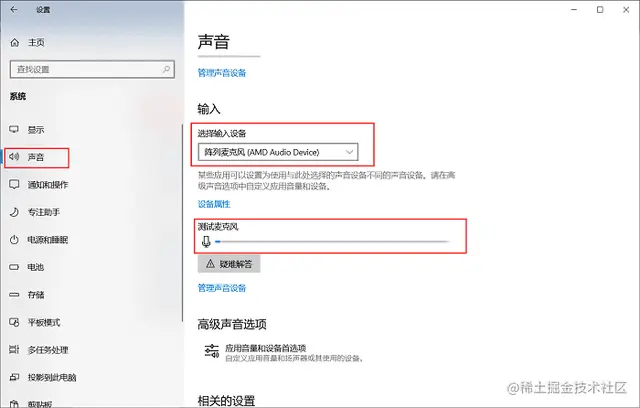 **步骤2:**在【系统】界面,点击【声音】。在【声音】界面,将【选择输入设备】中的功能切换成【麦克风】。然后对着麦克风说话,可以观察下方的【测试麦克风】的语音波动。