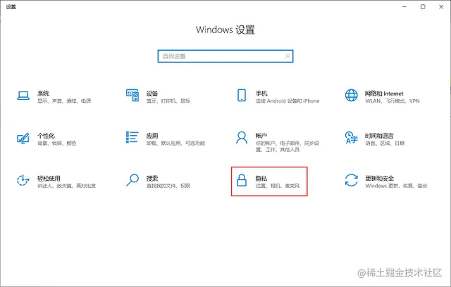 **步骤1:**打开电脑系统设置,并在电脑设置界面,点击【隐私】。
