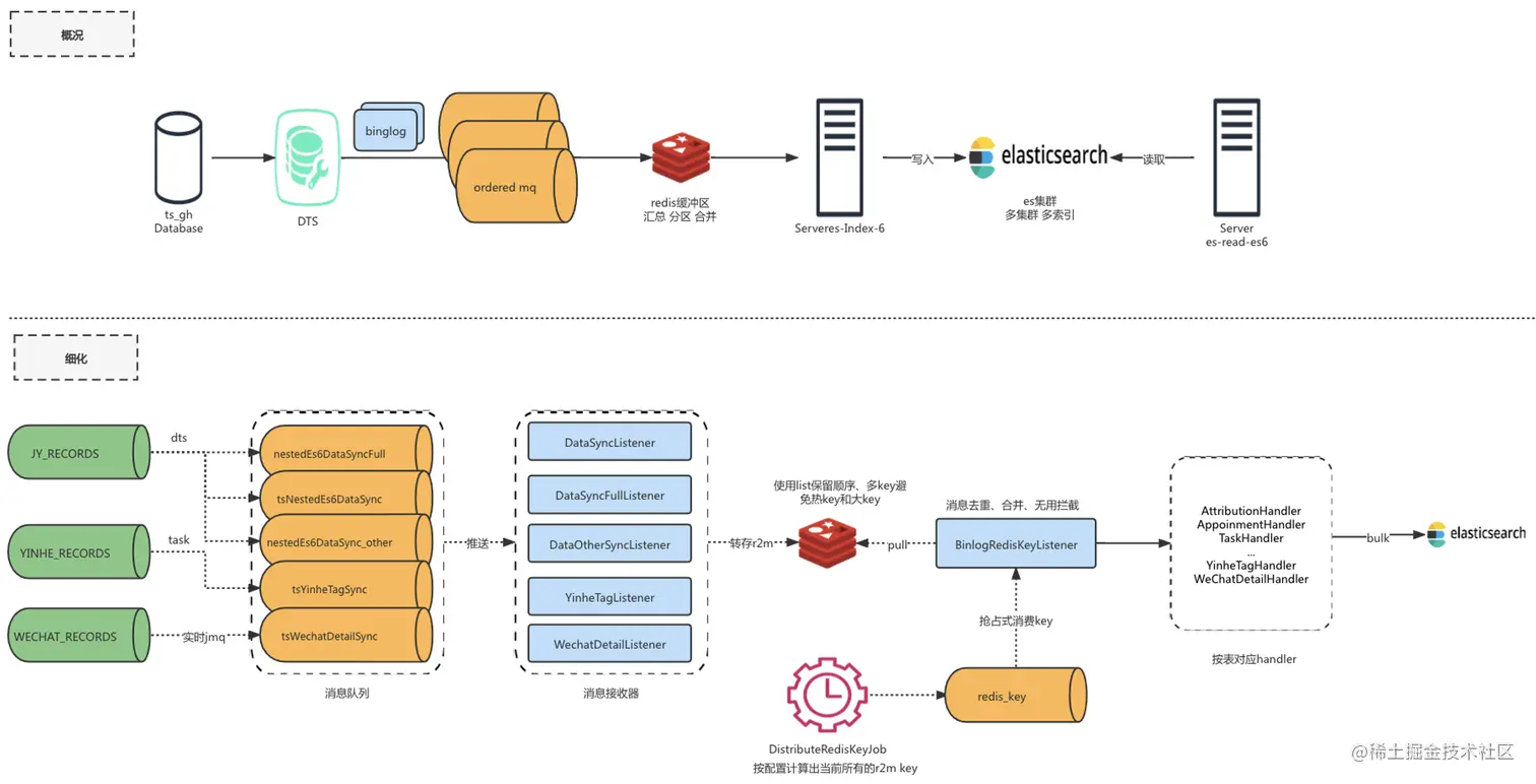 elasticsearch集群也使用了类似mysql思想做了配置化的垂直拆分,在数据写入时按主维度对信息流做了合并,在京音的业务场景下,把一次事务的批量数据合并成一条数据写到elasticsearch,极大的降低了elasticsearch的写入频率,另外一些主键、切分键等适合mysql查询的场景优先走mysql,充分使用不同存储引擎的优点满足各类业务场景需求。