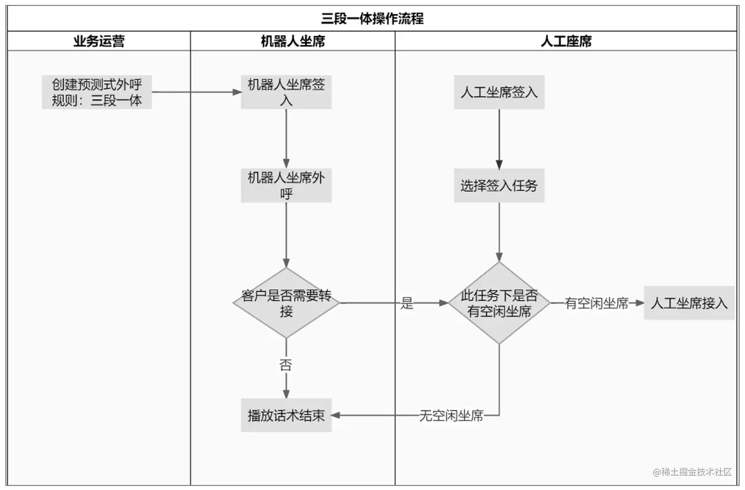 三段一体外呼:三段一体外呼在预测式外呼的基础上增加了机器人坐席与客户沟通,在识别到客户有意向后再转接到人工坐席,增加此步骤目的是进一步过滤掉接通了但无意向的客户,从而将人工坐席的价值最大化,三段一体外呼操作流程如下: