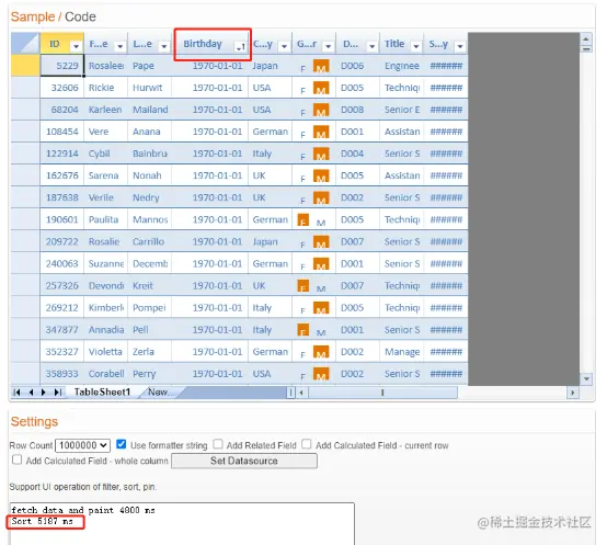 100W行数据排序花费时间在5S左右(Sort birthday == "Ascending")。