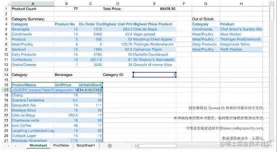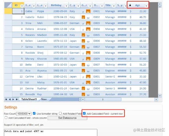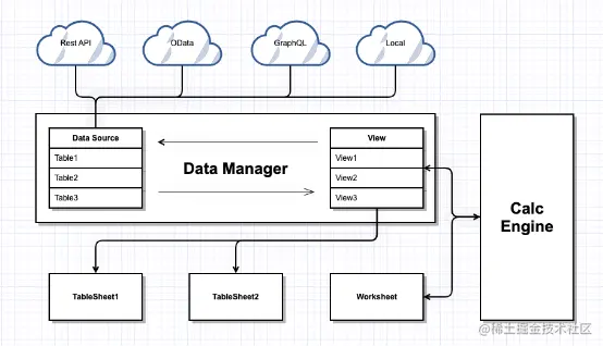 Data Manager负责拉取远端数据,远端数据源可以是Rest API、OData、GraphQL、Local。Data Manager在拉取数据源之后会根据其中的定义构建数据表(Data Source),该表结构与数据库中的表结构类似。之后通过这些表来定义对应的数据视图(View),视图中定义了展示的结构以及计算列,关系列的添加。最终将不同的视图(View)绑定在不同的Table Sheet上。Table Sheet负责对所有的视图进行展示和操作。Calc Engine在Data Manager上工作,而非直接工作在Table Sheet上,这是为了更方便的去支持集算表与普通工作表之间的公式引用。这使得集算表与普通工作表之间产生“化学效应“,例如下面的示例: