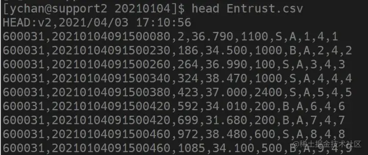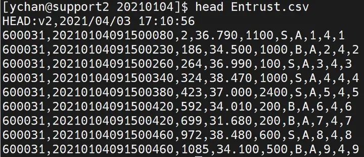 下图是通过 head 命令查看的上市委托数据的 CSV 文件。