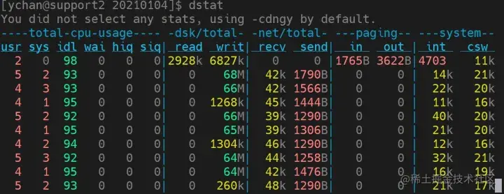 在数据导入的过程中,如果对导入的性能存在疑虑,可以通过一些工具观测系统资源使用情况,判断是否存在资源利用的瓶颈。在 Linux 系统的终端中输入 dstat 命令,可以查看硬盘写入情况。 如下图所示: