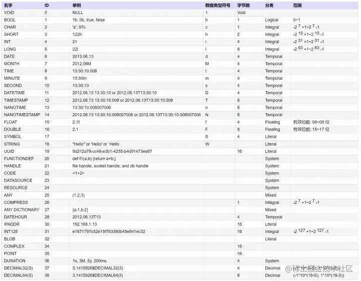 在这些数据类型中,整型、浮点型与其他数据库相同,可直接根据数据精度选择。DolphinDB 比较有特色的是如下两种类型: