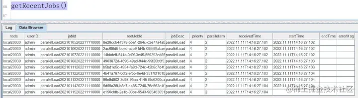 loadOneDayFile 和 parallelLoad 这两个函数的写法不唯一,可以根据数据的存储格式参考本案例代码灵活设计。主要目的是按天提交任务,每个任务导入某种数据一天的数据。这些代码执行完成后,会马上返回,所提交的异步任务会在后台执行,可以调用 getRecentJobs 函数查看后台的任务执行情况。任务情况如下图所示: