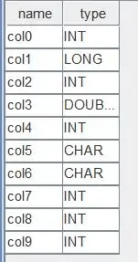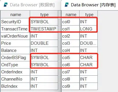 通过对比可以发现,内存表中的字段 col0, col1, col5, col6 与数据表中对应字段 SecurityID, TransactTime, OrderBSFlag, OrdType 的类型不同。如果此时直接进行数据导入,如下代码所示:
