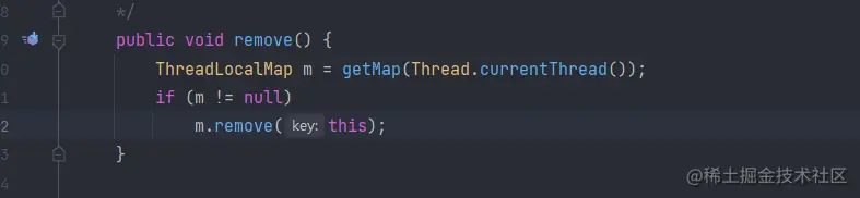 ThreadLocal 还有一个 remove() 方法,用来移除当前 ThreadLocal 对应的值。同样也是同过当前线程的 ThreadLocalMap 来移除相应的值。