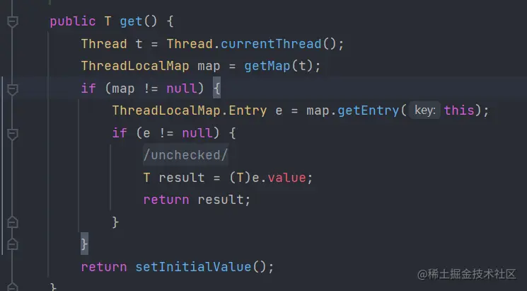 在 get() 方法中也会获取到当前线程的 ThreadLocalMap,如果 ThreadLocalMap 不为 null,则把获取 key 为当前 ThreadLocal 的值;否则调用 setInitialValue() 方法返回初始值,并保存到新创建的 ThreadLocalMap 中。
