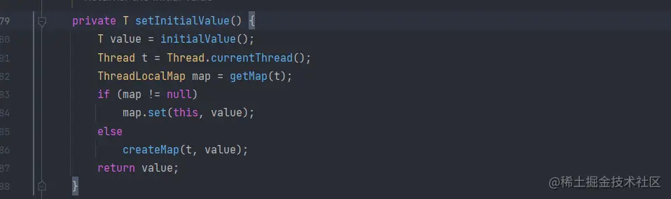 initialValue() 是 ThreadLocal 的初始值,默认返回 null,子类可以重写改方法,用于设置 ThreadLocal 的初始值。