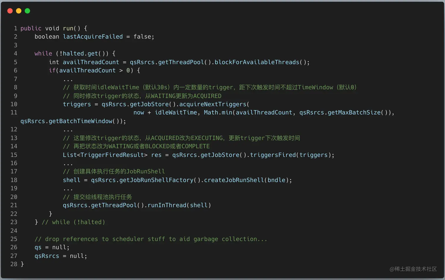 执行任务调度的核心类是 QuartzSchedulerThread 。