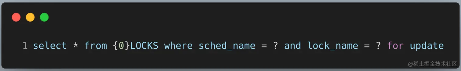 scheduler实例在集群模式下首先获取{0}LOCKS表中的行锁,Mysql 获取行锁的语句: