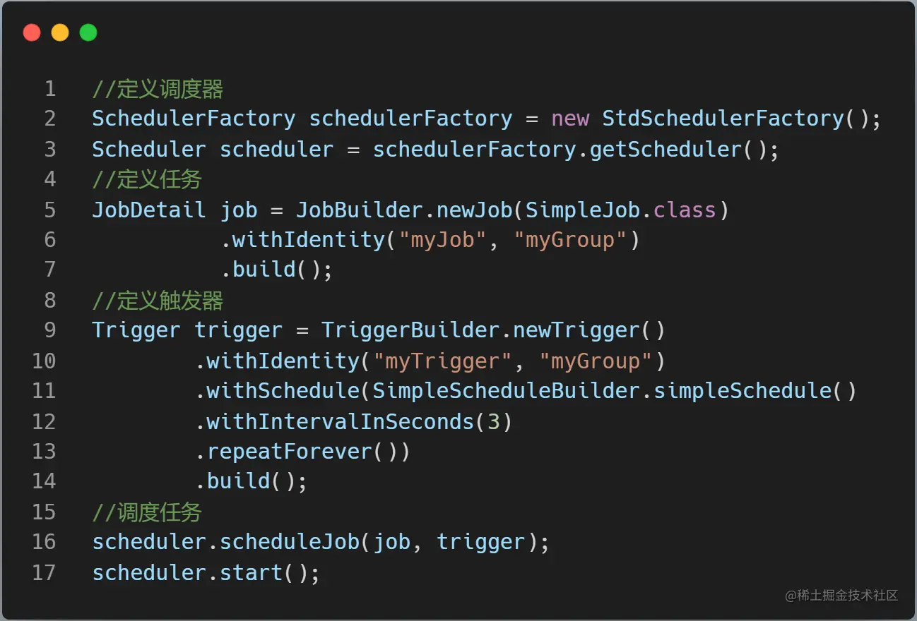 - 调度器 :工厂类创建Scheduler,根据触发器定义的时间规则调度任务。