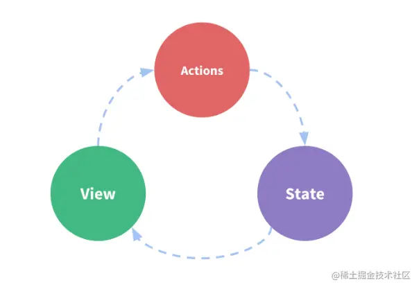 Vue Components需要变更时,首先要调用dispatch(派发)方法,派发一个行为(更改state的行为)。如果在这一步与后端有数据交互,则需要先在这一步中完成,而后端返回的数据通过actions中的commit(发射)调用Mutations里的方法,而Mutations里的方法被调用之后就会去更新state。在state更新完成之后又就会触发render函数并重新渲染Vue Components。