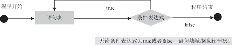 以上语句的执行过程是,首先执行一次循环操作,然后再判断 while 后面的条件表达式是否为 true,如果循环条件满足,循环继续执行,否则退出循环。while 语句后必须以分号表示循环结束,其运行流程如图 2 所示。