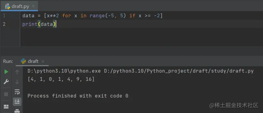 data = [x**2 for x in range(-5, 5) if x >= -2]