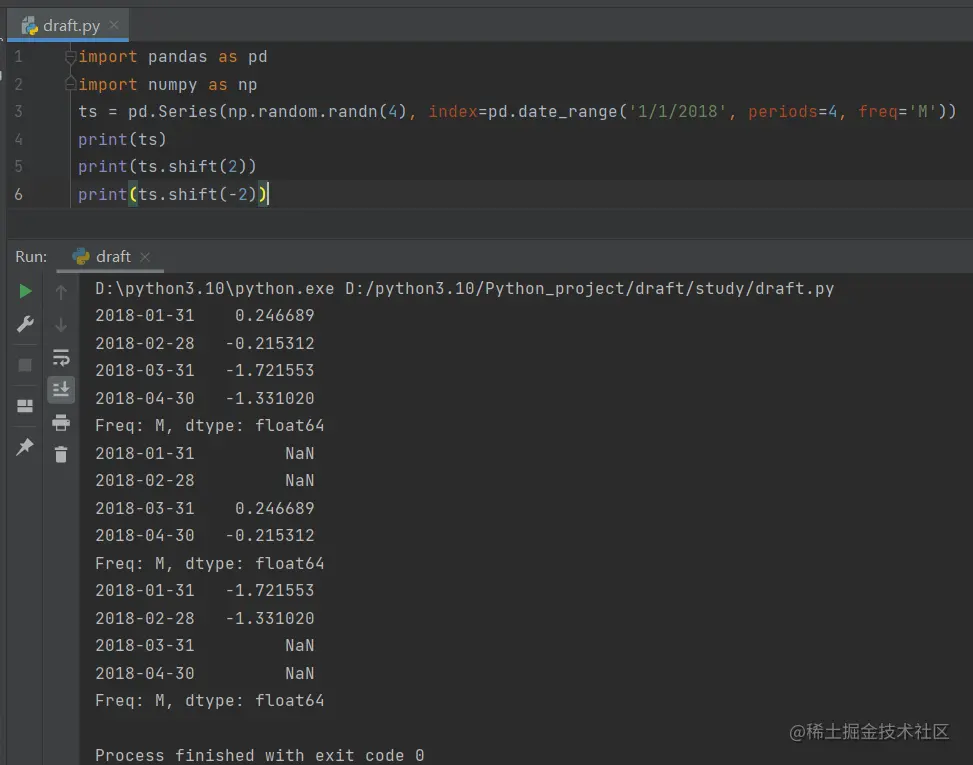 - ts.shift(2)把ts的结果往后移两位,即2018-01-31的数据移动至2018-03-31,2018-02-28的数据移动至2018-04-30,由于2018-01-31和2018-02-28不存在前两位的数据,因此移动后两者数据为NaN。同理,ts.shift(-2)把ts的结果往前移两位,因此2018-03-31和2018-04-30两者数据为NaN
