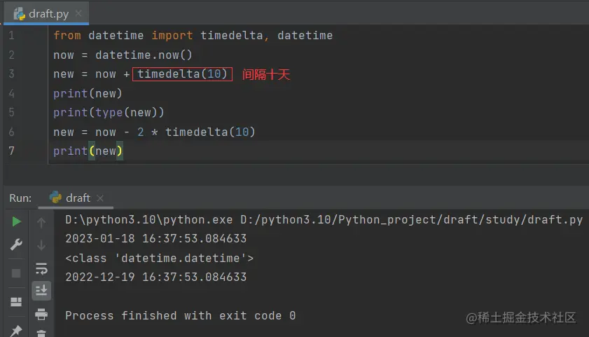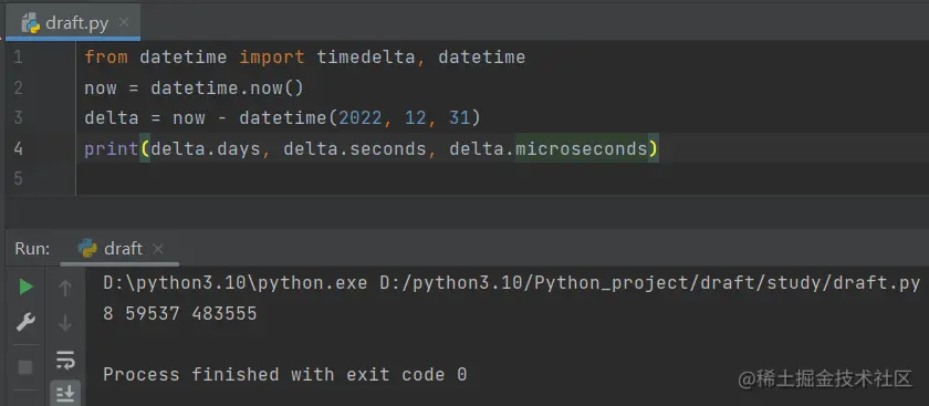 - 两个datetime对象之间的时间差(日、秒、毫秒)为timedelta类型