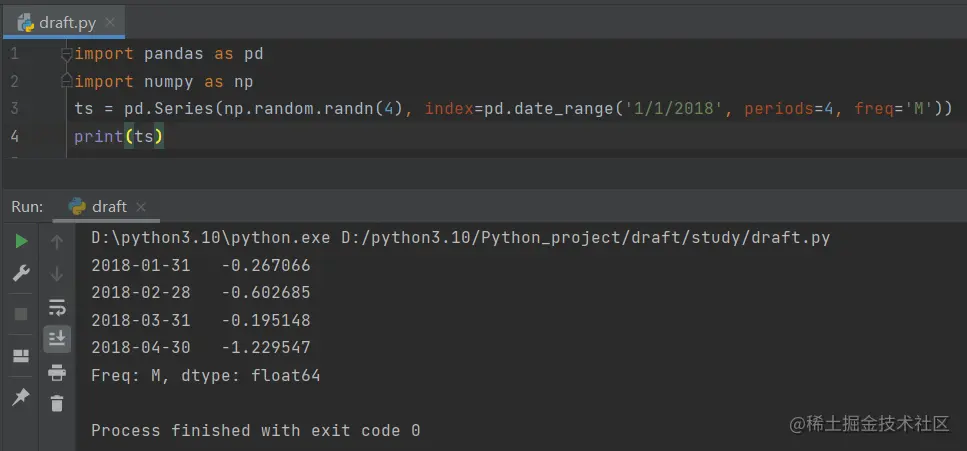 ts = pd.Series(np.random.randn(4), index=pd.date_range('1/1/2018', periods=4, freq='M'))