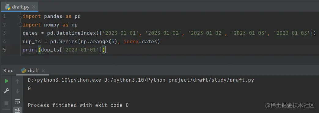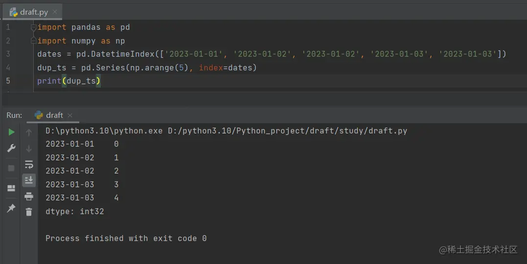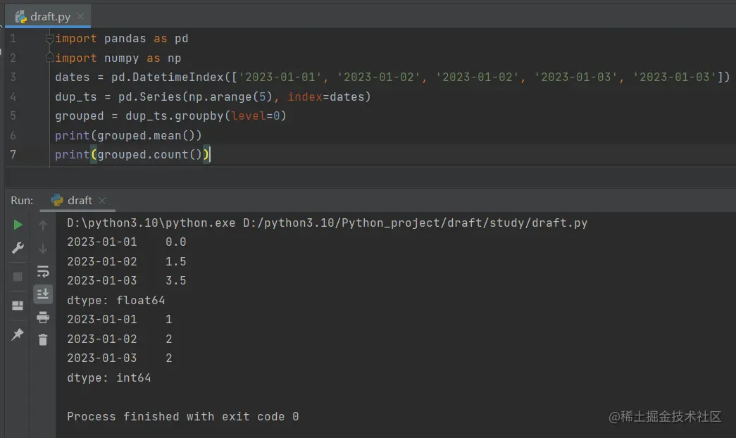 import pandas as pd import numpy as np dates = pd.DatetimeIndex(['2023-01-01', '2023-01-02', '2023-01-02', '2023-01-03', '2023-01-03']) dup_ts = pd.Series(np.arange(5), index=dates) grouped = dup_ts.groupby(level=0) print(pd.Series(grouped)) - 之后可使用mean()和count()等函数对分组后的数据按时间戳进行聚合