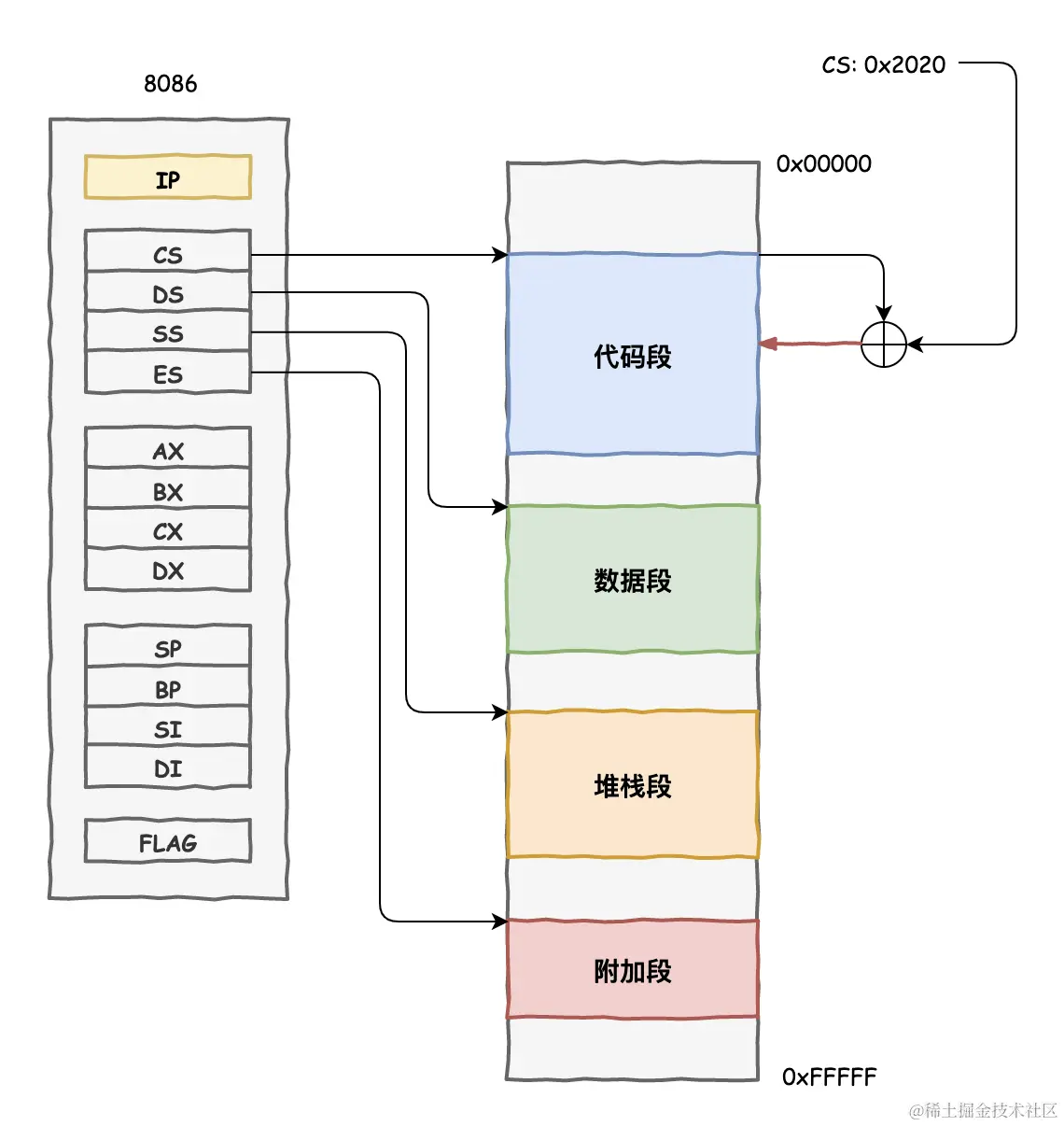 但是祖先的寄存器都是16位的啊,只能存放16位的地址。不过他们很聪明,发明了一个叫分段式存储管理的方法,把内存划分为最大64KB的小块,为什么是64KB呢,因为16位地址最多只能寻址这么大了。然后又加了几个叫做段寄存器的东西,指向这些块的开头,这样,通过段地址+段内偏移地址的方式,就能访问更多的内存了。