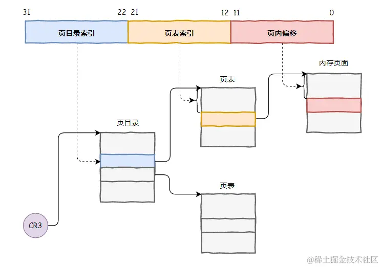 为此,在我们寄存器内部专门添置了一个新的寄存器CR3,用来指向一个地址翻译查询字典,字典划分了两级目录。我们把一个32位的地址划分了3部分,前面两部分分别指向两级目录中的条目,用来定位这个地址在物理内存的哪个页面,最后一部分就是指向物理内存页面的偏移,这样就完成了地址的翻译工作。