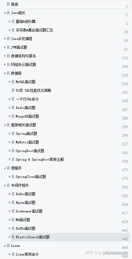 这套互联网 Java 工程师面试题包括了:基础 &进阶篇字符串 &集合面试题汇总、.Java 并发编程、JVM、数据结构与算法、网络协议、数据库、MySQL、52 条 SQL 性能优化策略、一千行 SQL 命令、Redis、MongoDB、Spring、MyBatis、SpringBoot、Spring & SpringBoot 常用注解、微服务、Dubbo、Nginx、Zookeeper、MQ、kafka、Elasticsearch、Linux 面试专题(共 485 页,24W 字)