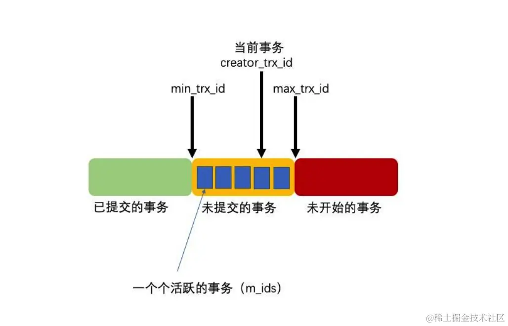 min_trx_id:表示在生成Read-View时当前系统中活跃的读写事务中最小的事务id,也就是m_ids中的最小值。 -