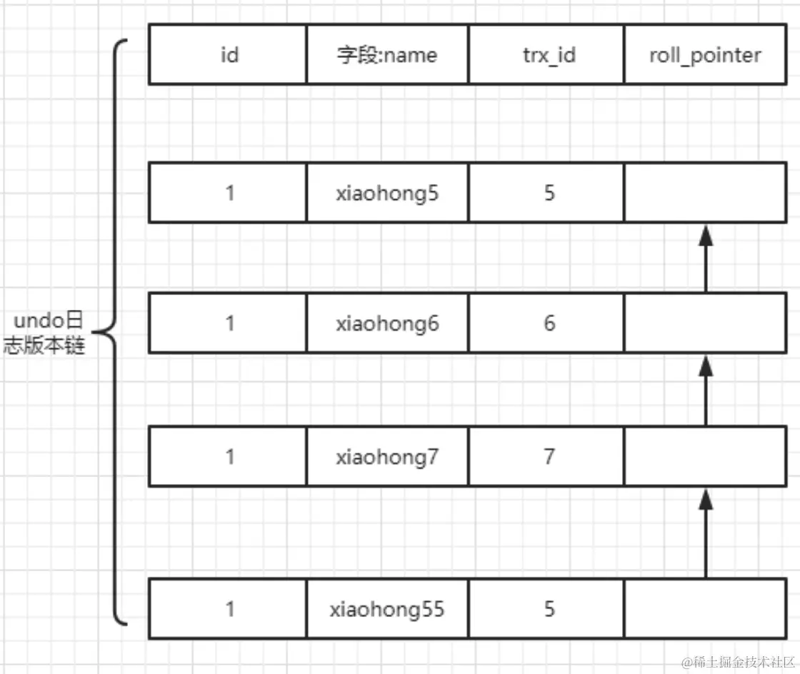 undo日志版本链是指一条数据被多个事务依次修改过后,在每个事务修改完后,Mysql会保留修改前的数据undo回滚日志,通过事务ID(trx_id)和roll_pointe(指向上一条undo日志记录)把这些undo日志串联起来形成一个历史记录版本链。 begin/start transaction 命令并不是一个事务的起点,在执行到它们之后的第一个修改操作InnoDB表的语句, 事务才真正启动,才会向MySQL申请事务id,MySQL内部是严格按照事务的启动顺序来分配事务id的。