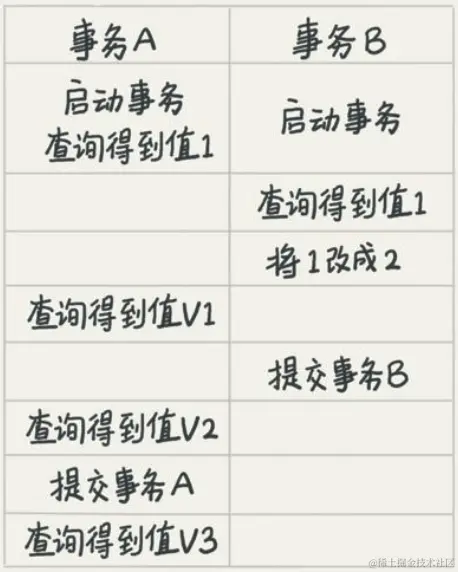 V1的值就是2。这时候事务B虽然还没有提交,但是结果已经被A看 到了。因此,V2、V3也都是2。 -