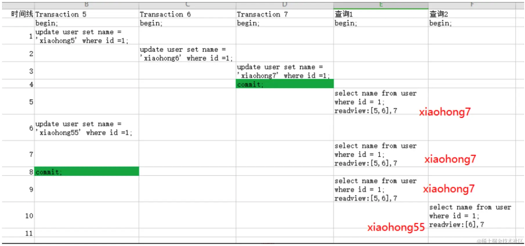 查询 2 的查询语句是在事务 5 提交之后执行的,因此它生成的一致性视图和查询 1 是不一样的,它的视图中未提交事务ID数组只有事务 6 ,因此它能够查询得到xiaohong55 事务 1 提交的结果。