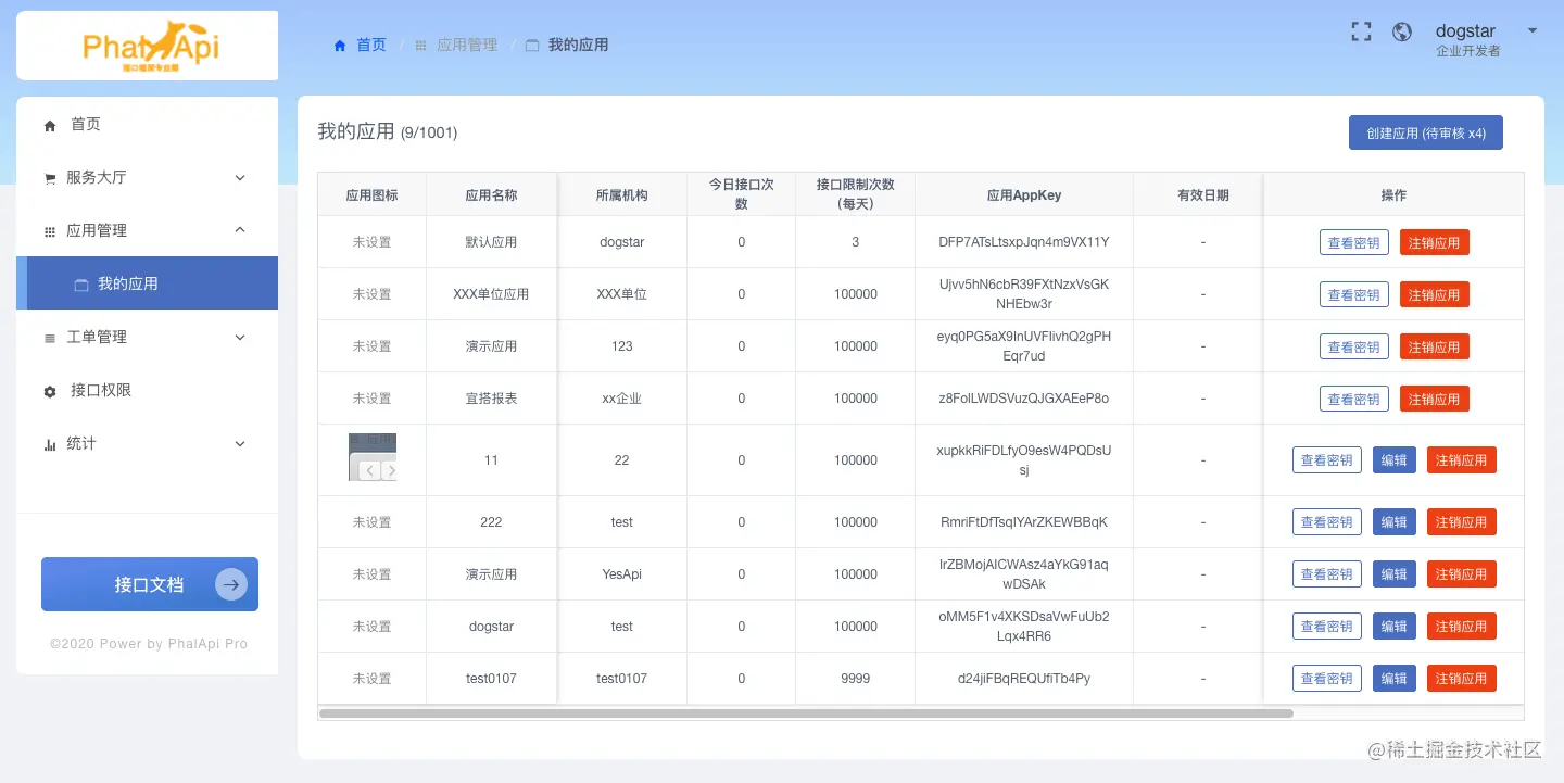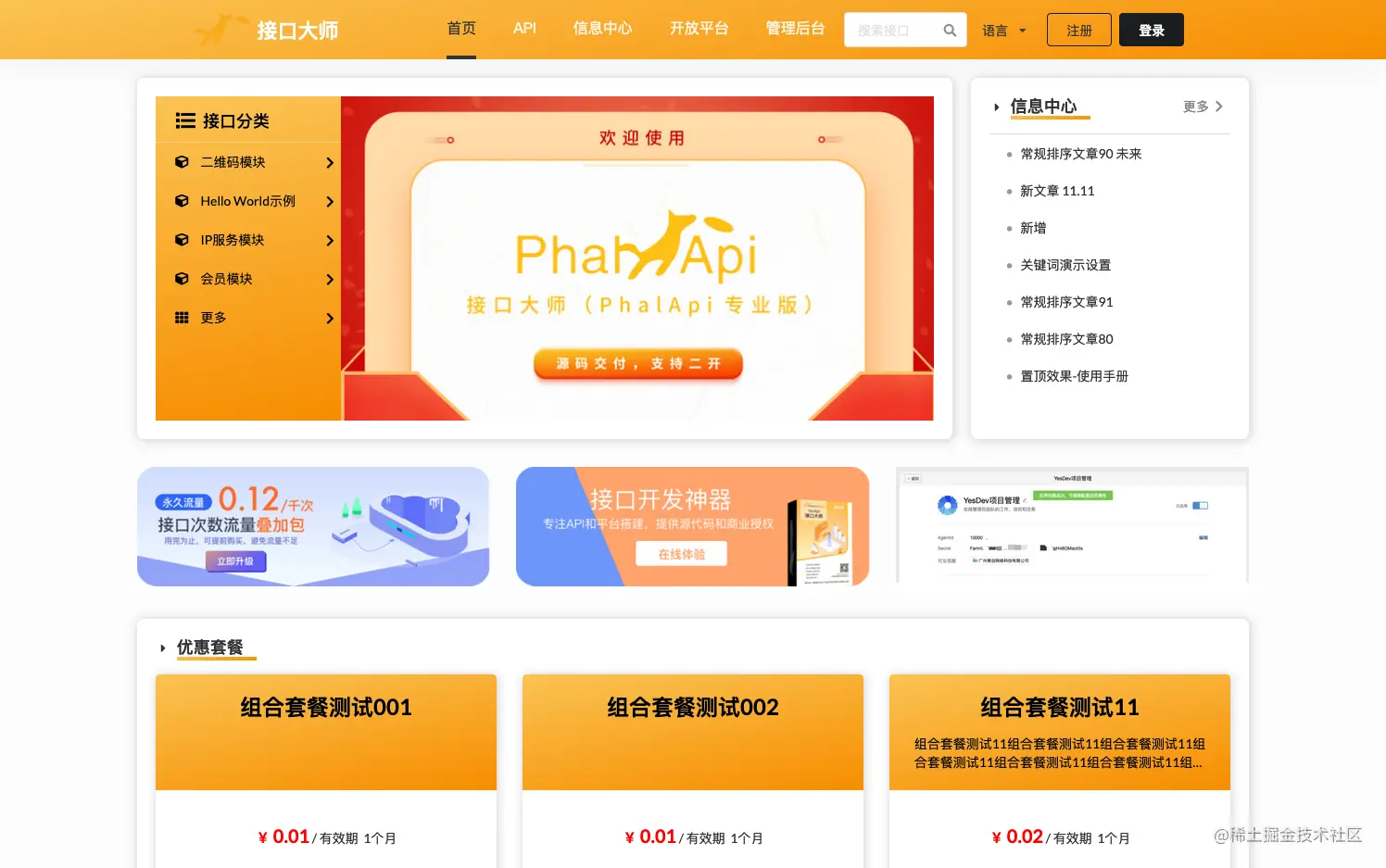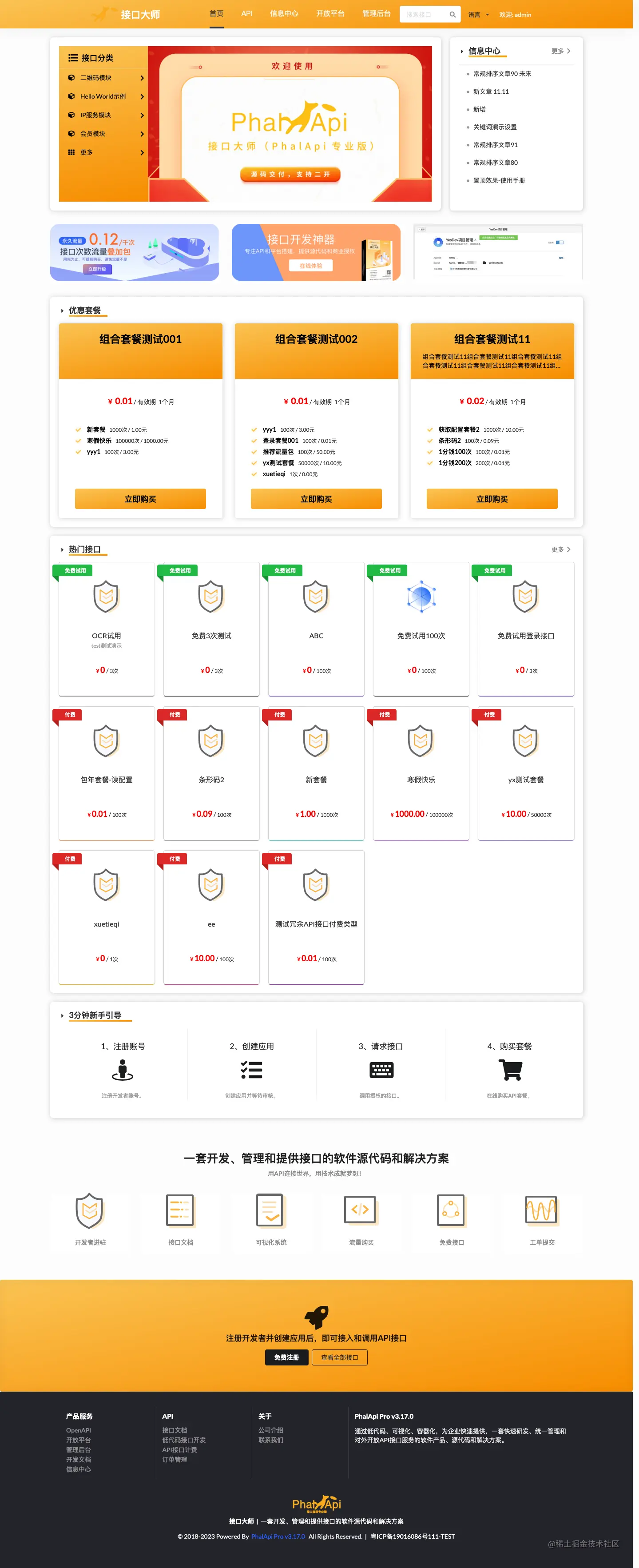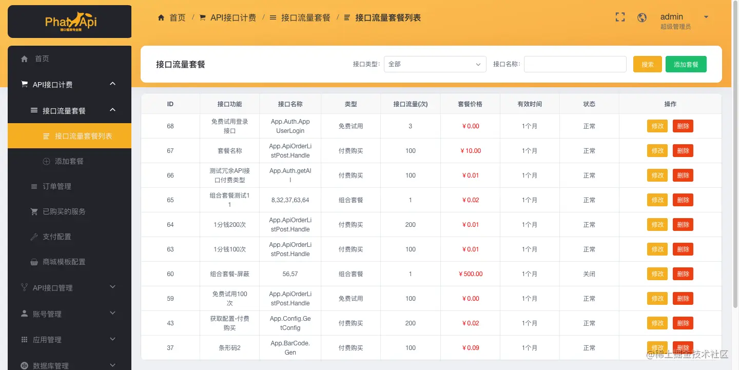 - 热门接口:支持后台设置接口免费试用套餐和接口收费套餐;