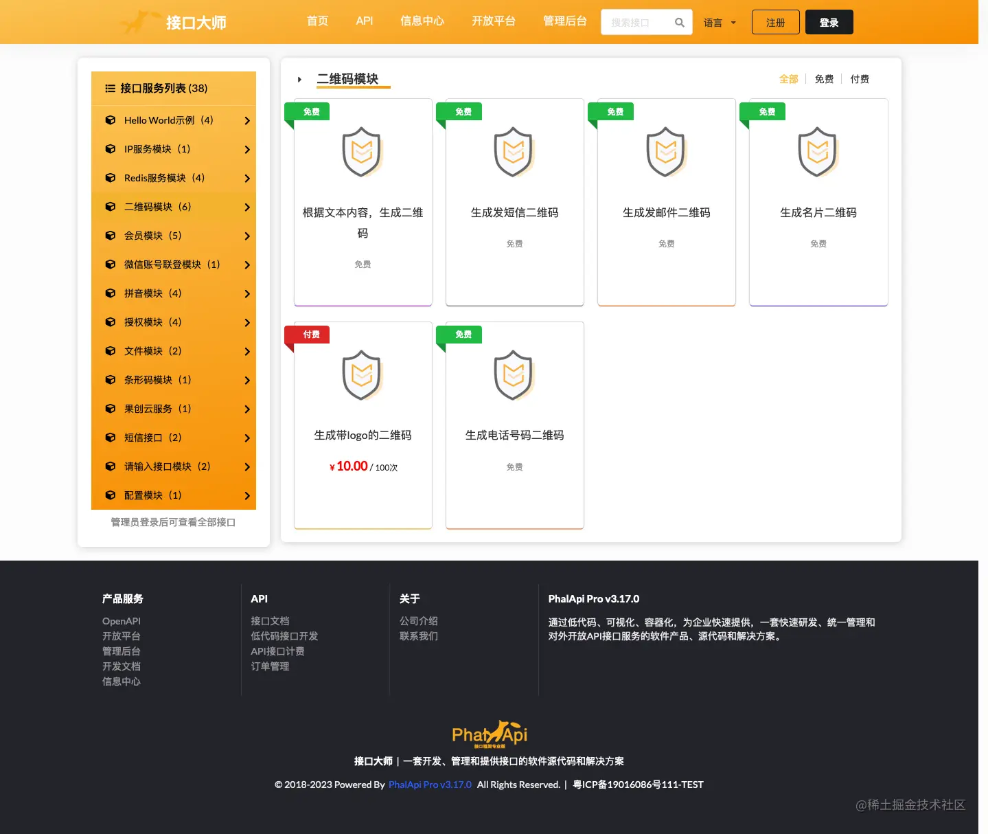接口商城分类页,可以展示和快速搜索全部的接口模块,以及每个接口模块的免费、付费接口。如果是管理员账号,可以查看全部的接口,即包括内部管理后台等API接口。