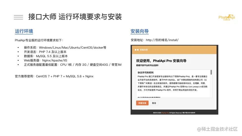 YesApi的主要技术栈是:PhalApi接口框架(PHP) + Vue(前后端分离) + MySQL(数据库) + Semantic UI(前台模板)。