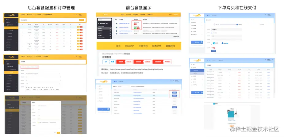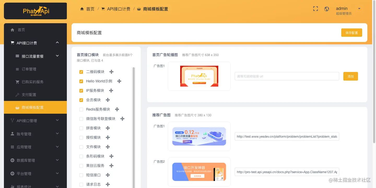 管理端:商城后台配置、接口套餐配置、支付配置、接口图标配置等。