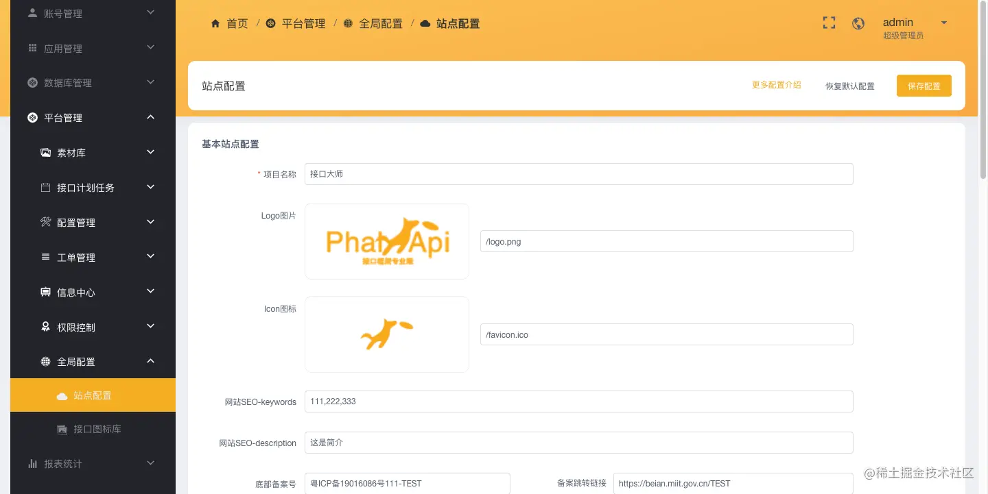 - 3、新增支持:全局配置、站点配置和接口图标库配置,提供更灵活的平台网站运营能力;