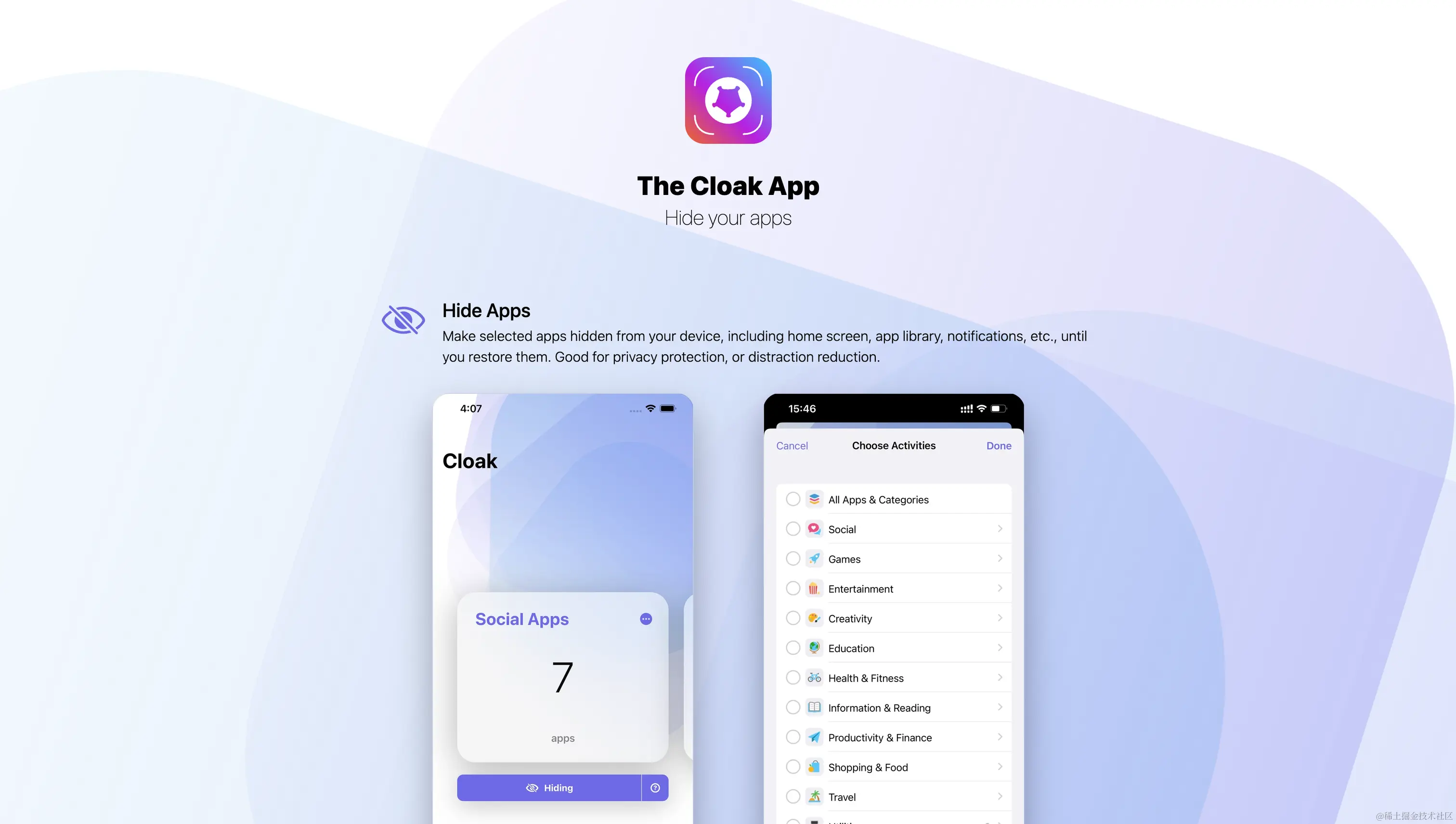 作者 @ezzz_au 发布的一款小工具 CloakApp, 可以将指定的 App 从 iPhone / iPad 上隐藏,主屏幕、App 资源库和通知等都不再显示这些应用程序, 直到您将它们还原。「安全区」功能可在您离开住处或工作场所时自动隐藏选定的应用。应对「查手机」更加从容。