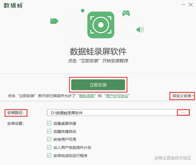 **第一步:**在网页上获取安装包后,点击“立即安装”。开始安装程序,可以“自定义安装”更改安装程序路径。