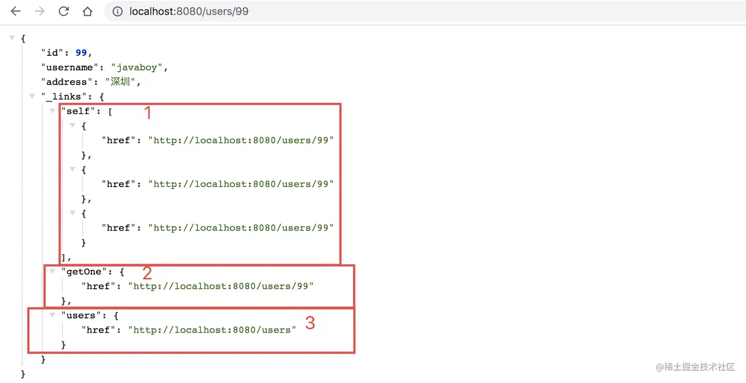- 第一部分,self,就是自身的访问链接,这三个链接分别是 User 的构造方法,以及前面提到的 3.3 和 3.4 的方法生成的。