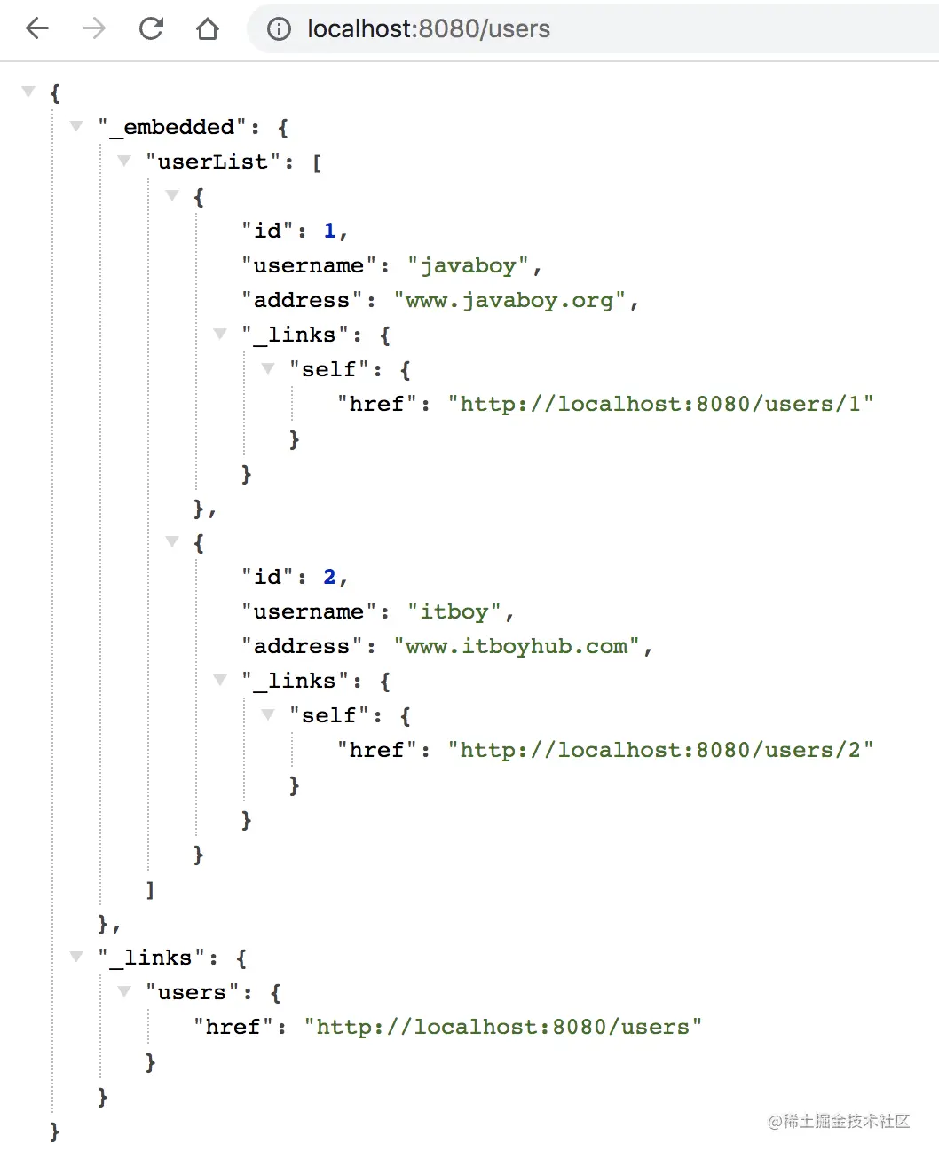 可以看到,返回的每一个 user 对象中,都有一个链接表示如何单独访问这个对象。最下面还有一个访问所有对象的链接。