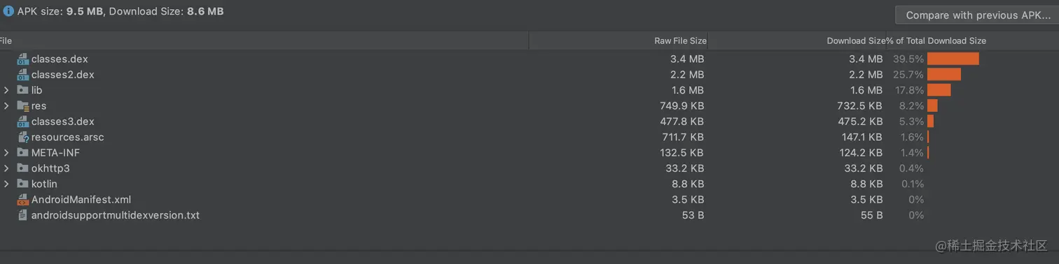直接将 apk 拖进 Android Studio 中就可以自动使用 Analyze APK 打开 apk。然后就可以看到 APK 文件的绝对大小以及各组成文件的百分占比,如下图所示:
