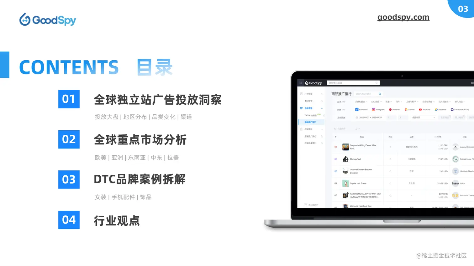 本报告由 GoodSpy 发布,同时邀请 Enjoy出海、猎豹移动、跨境眼观察、跨境知道、易点天下、AMZ123-品牌方舟 等行业上下游共同探讨,从全球独立站广告投放洞察、全球重点市场分析、DTC品牌案例拆解和行业观点四大方面为跨境商家提供市场、选品、营销等方面的情报和洞察。