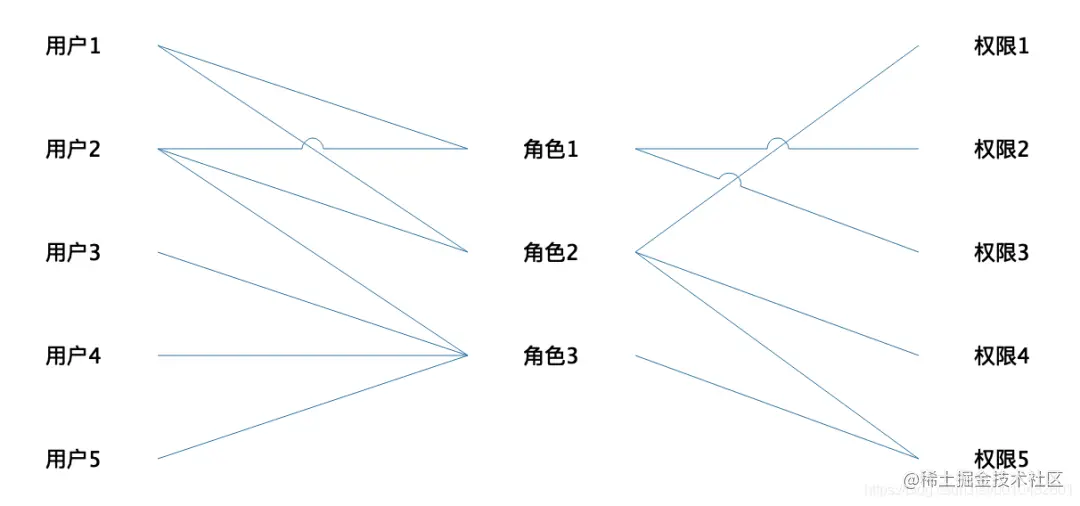 有了角色之后可以把权限分配给角色,需要相同权限的用户和角色对应起来就可以了,一个权限可以分配给多个角色,一个角色可以拥有多个权限,同样一个用户可以分配多个角色,一个角色也可以对应多个用户,对应模型如下所示: